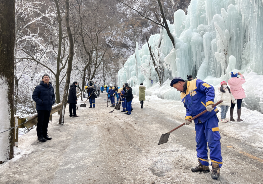 从太白山滑雪场驱车向上,就来到了莲花峰瀑布,道路右侧,大面积冰柱、冰挂营造出一个梦幻般的冰雪世界,路边不时出现的大型冰雪群雕晶莹剔透、栩栩如生。游客们纷纷驻足打卡,有序地在最佳拍照位轮流拍照,不拥挤,不扎堆,工作人员也在一旁清理道路上的冰雪,为游客营造安全的出行环境。