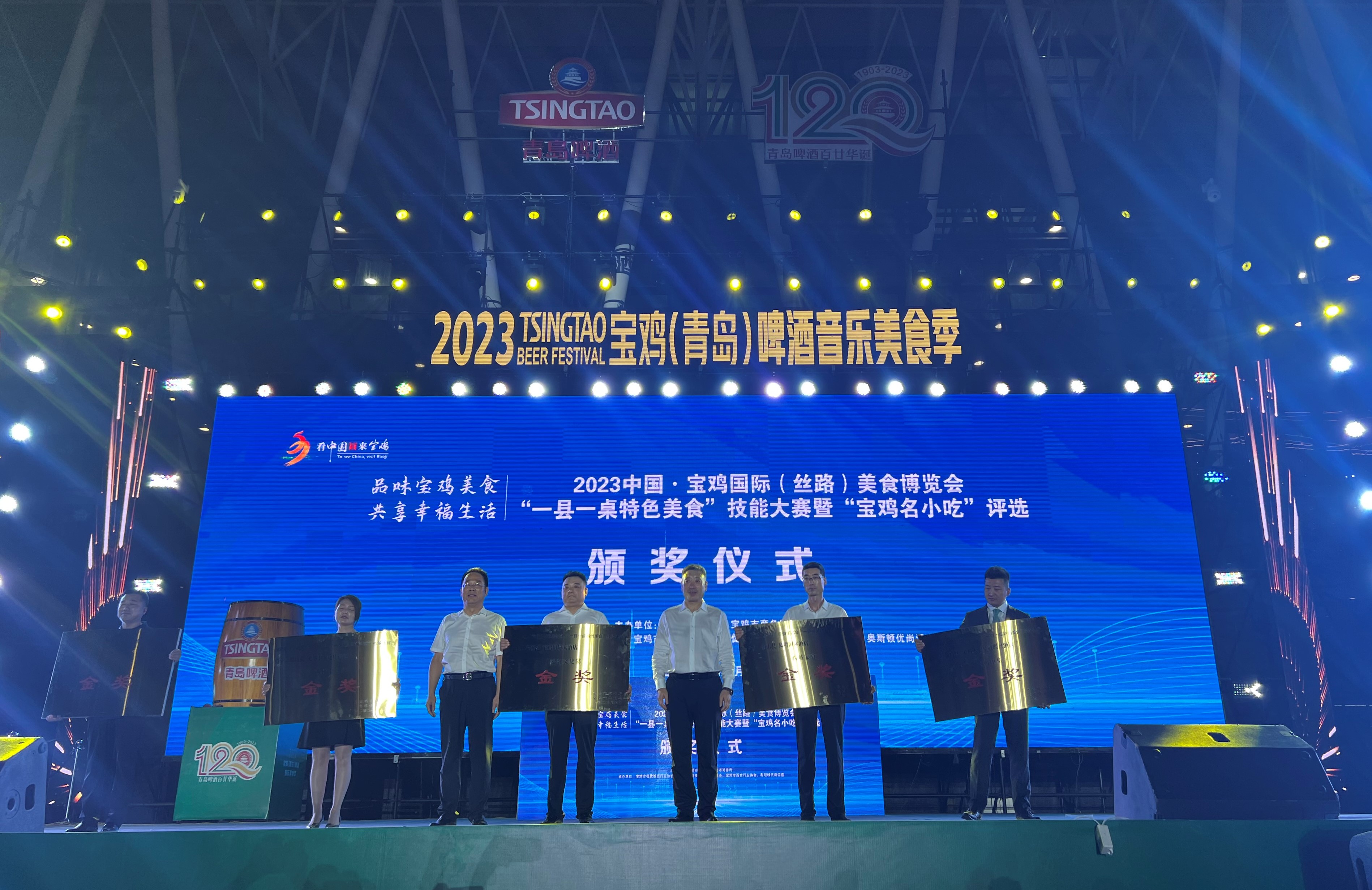 8月2日晚,我市举行2023中国.宝鸡国际(丝路)美食博览会“一县一桌特色美食”技能大赛暨“宝鸡名小吃”评选颁奖仪式。“凤翔海子全羊宴”等5桌美食获得“一县一桌特色美食”金奖,市领导陈小平、李武发为获奖者颁奖。