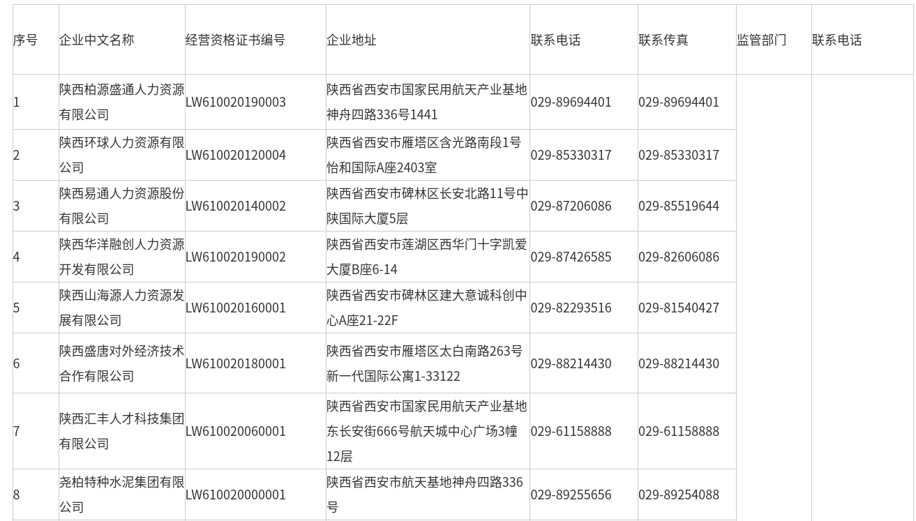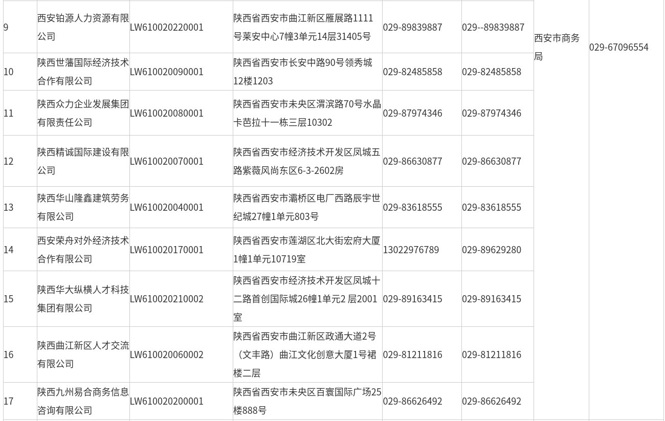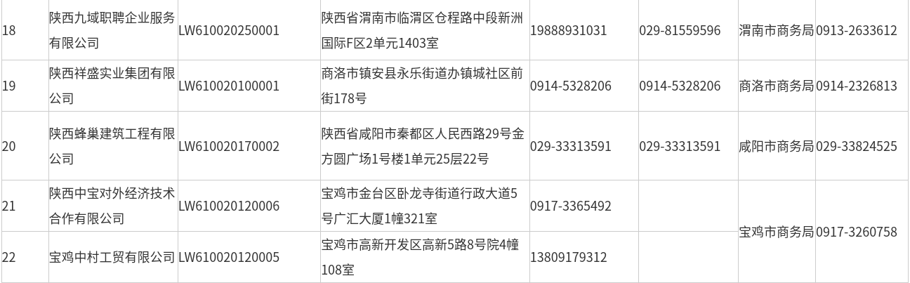 陕西省对外劳务合作企业名单(2026年4月)